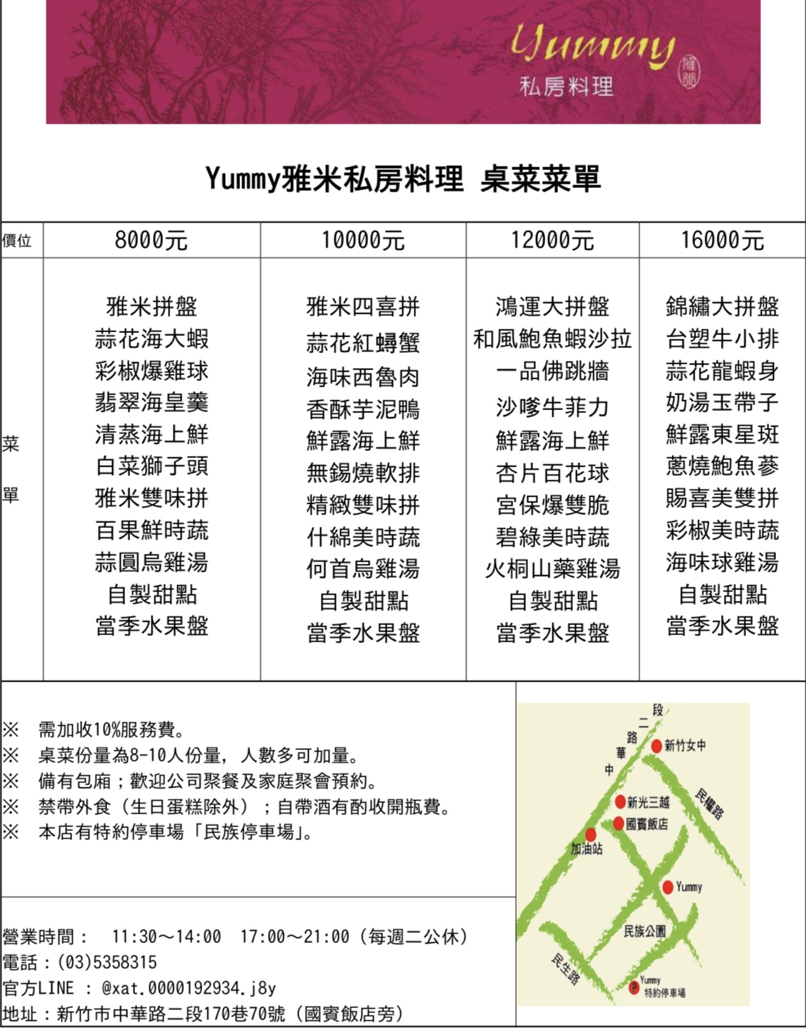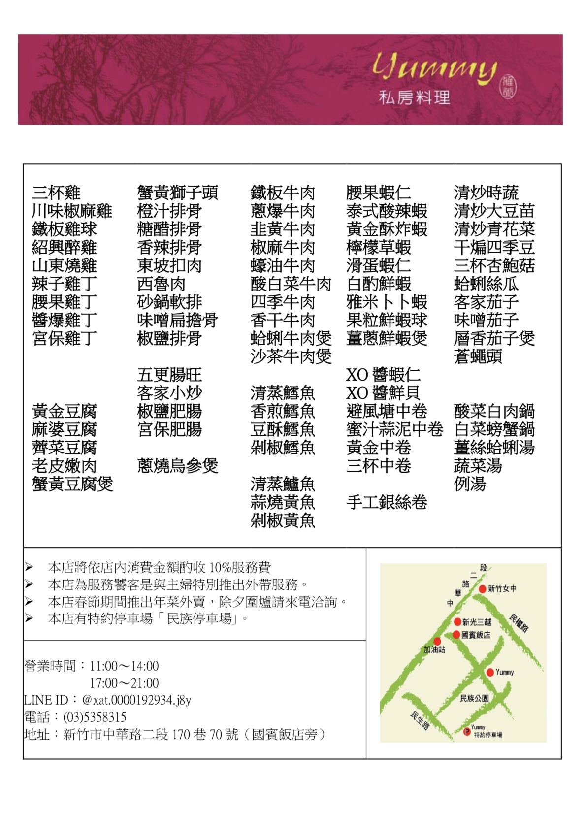 Yummy端上的是一桌家常,販售的卻是愛與繫絆;食材每日新鮮採買、嚴格把關;呈上的是創意料理,功夫底蘊卻扎實了得;巧思將自家純手工製作的味噌、醃瓜、醬冬瓜等客家珍醬入菜,讓川湘的香辣有了不一樣的驚喜,讓幫菜的醇厚風格更加豐美。